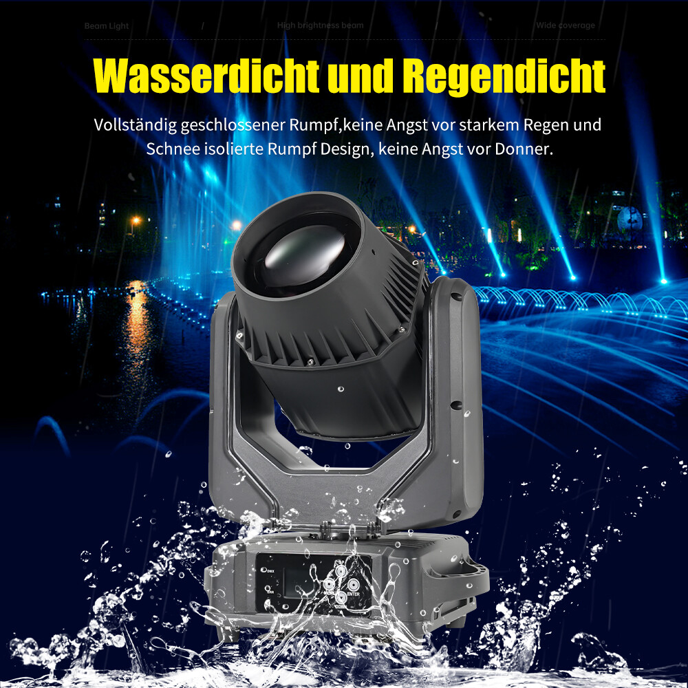 200W LED Beam Moving Head Light Waterproof Outdoor IP65, sehr heller Movinghead, 200W LED Lampe, Features Rotierende Gobos, Farbmischung, Farbrad, Prisma, 8 Kanäle, Gewicht 17 Kg, Leistungsaufnahme: max. 300 W -> Demo Video |