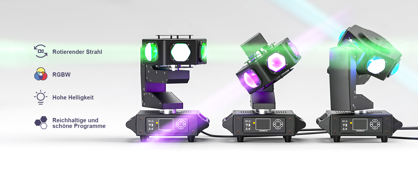 Ufo RGBW LED Movinghead, 300W LED,Nennleistung: 300WLichtquelle: 6 PCS 50W RGBW LEDSteuerungsprotokoll: Standard DMX512-Protokoll, RDM-ProtokollBeleuchtungswinkel: 2°Betriebswinkel:X-Achse: 540° FeineinstellungY-Achse: 320° FeineinstellungZ-Achse: Endlos drehbar, Durchschnittliche LED-Lebensdauer: 100000h, Blitzlicht: 0-20Hz, Betriebsmodus: automatisch, Sprachsteuerung, DMX, Master-Slave-Modus, Steuerungskanal: 14/16CH, Datenverbindung: 3-poliger XLR-Eingang/Ausgang, Display: 1,77-Zoll-Farbdisplay,Schutz Klasse: IP20-> Demo Video |