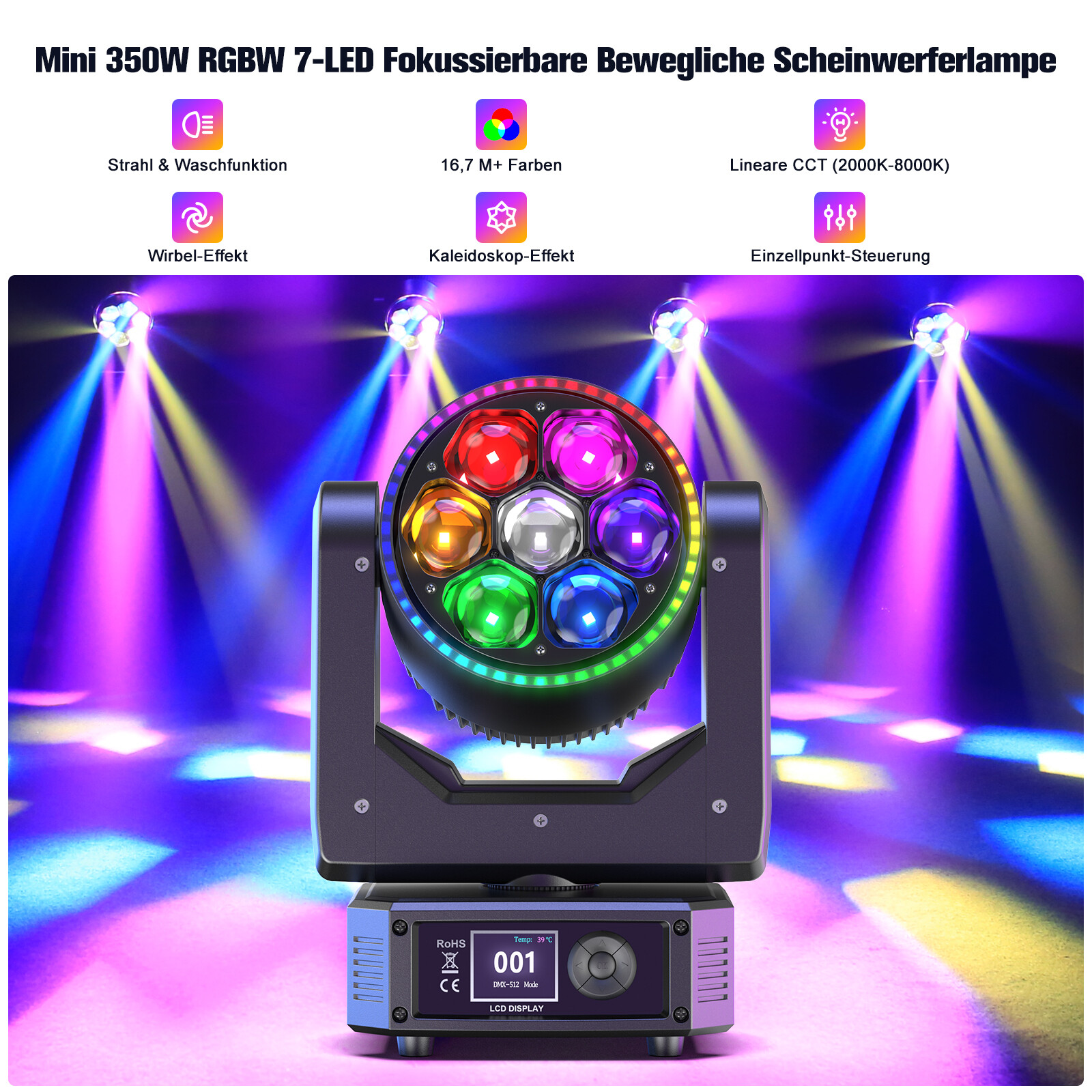 Wash BEE-EYE RGBW LED Movinghead, 350W LED,Nennleistung: 300W Gesamtleistung: 175 W, Lichtquelle: 7 x 50 W (RGBW) + 30 x 0,5 W (RGB) LEDs, Lichtaustrittswinkel: 4,5–45°,Farbtemperatur: 2000–8000 K, 360° Endlosdrehung,Betriebsmodus: Selbstfahrend, Sprachsteuerung, Master-Slave, DMX,Steuerkanäle: 30/42/58 Kanäle,DMX512 XLR-Eingang/Ausgang, IP20, Produktgröße: 242 x 184 x 340 mm, Nettogewicht: 5,7 kg -> Demo Video |